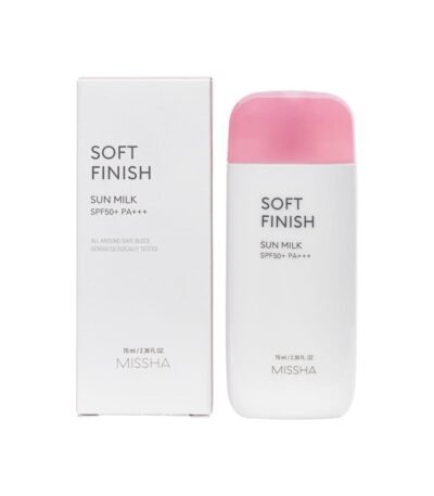 Missha All Around Safe Block Soft Finish Sun Milk SPF50+ PA+++ একটি লাইটওয়েট এবং রিফ্রেশিং সান মিল্ক ফর্মুলা যা UVA এবং UVB রশ্মি থেকে ত্বককে রক্ষা করে এবং জল ও ঘামের প্রতিরোধী।